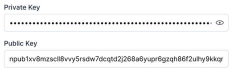 The public key starts with a prefix npub1 and the private key with the prefix nsec1. Make sure you store you private key somewhere safe, like a password manager.