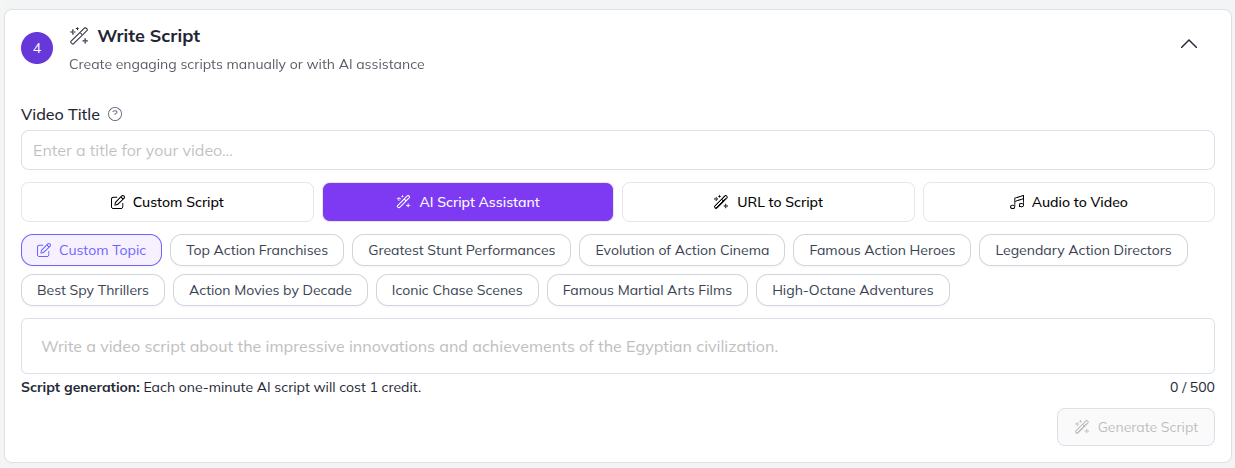 Input your topic, choose a tone (upbeat, professional, or funny), and select a video length (30 seconds to 5 minutes). Within moments, you’ll have a polished script ready to go.