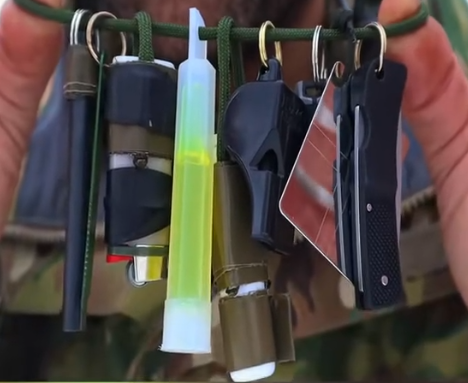 Secure optional items (e.g., knife in a sheath, ferro rod, whistle) with split rings or knots like a lanyard knot. Ensure sharp items are safely sheathed.