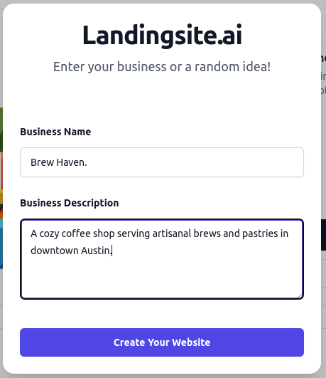 Enter “Brew Haven” and “A cozy coffee shop serving artisanal brews and pastries in downtown Austin.”