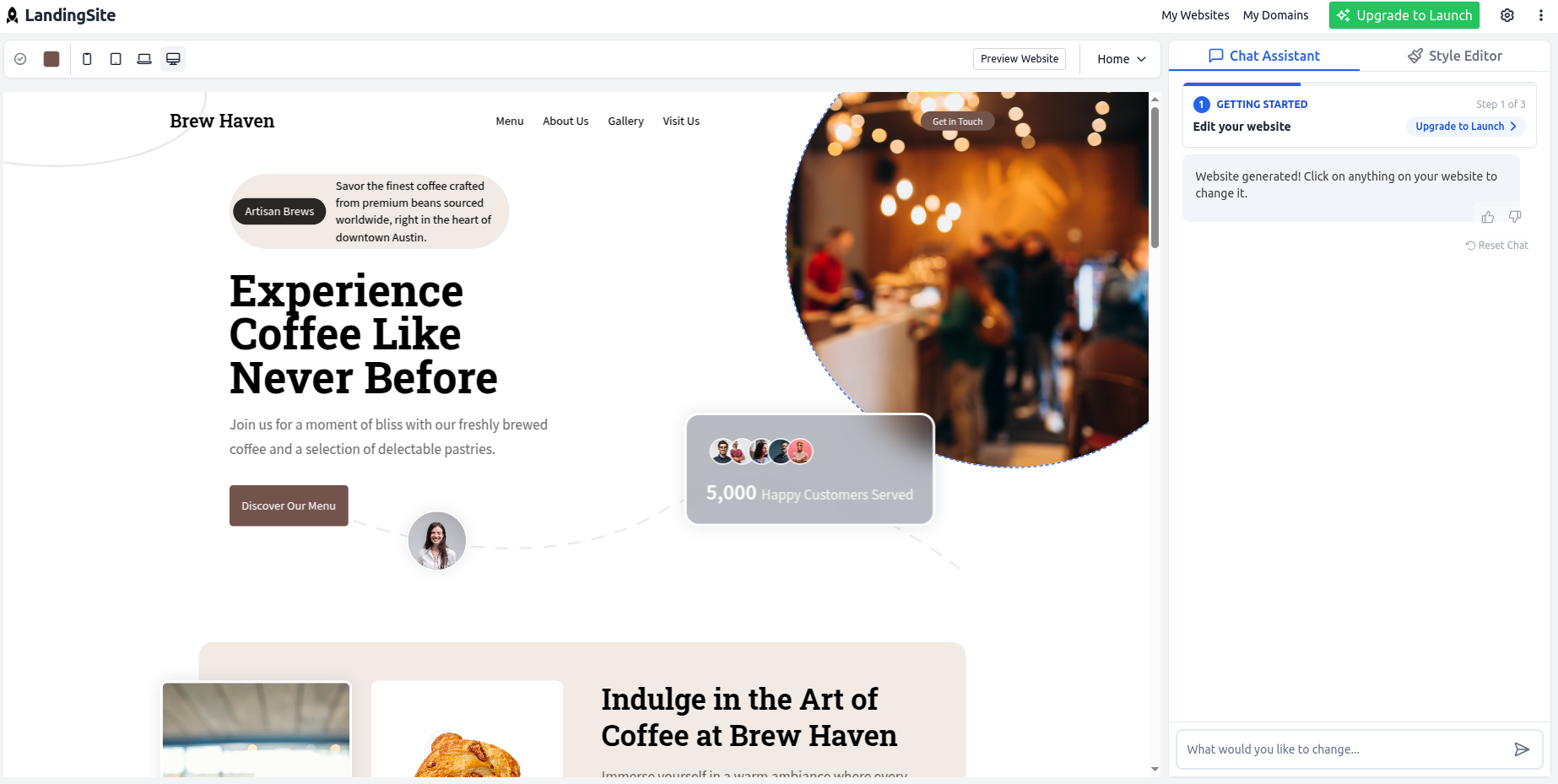 The AI generates a site with a warm-toned template, coffee-related images, and text like “Welcome to Brew Haven – Your Daily Dose of Artisanal Coffee.”