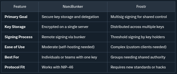 NsecBunker is already practical for everyday use, while Frostr represents the cutting edge—something that could evolve into a standard if the Nostr community adopts it.