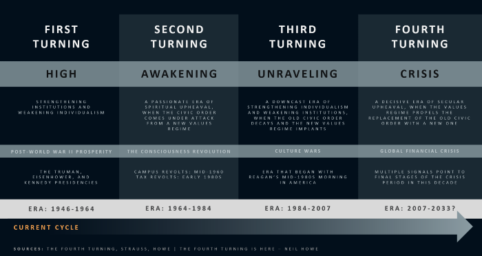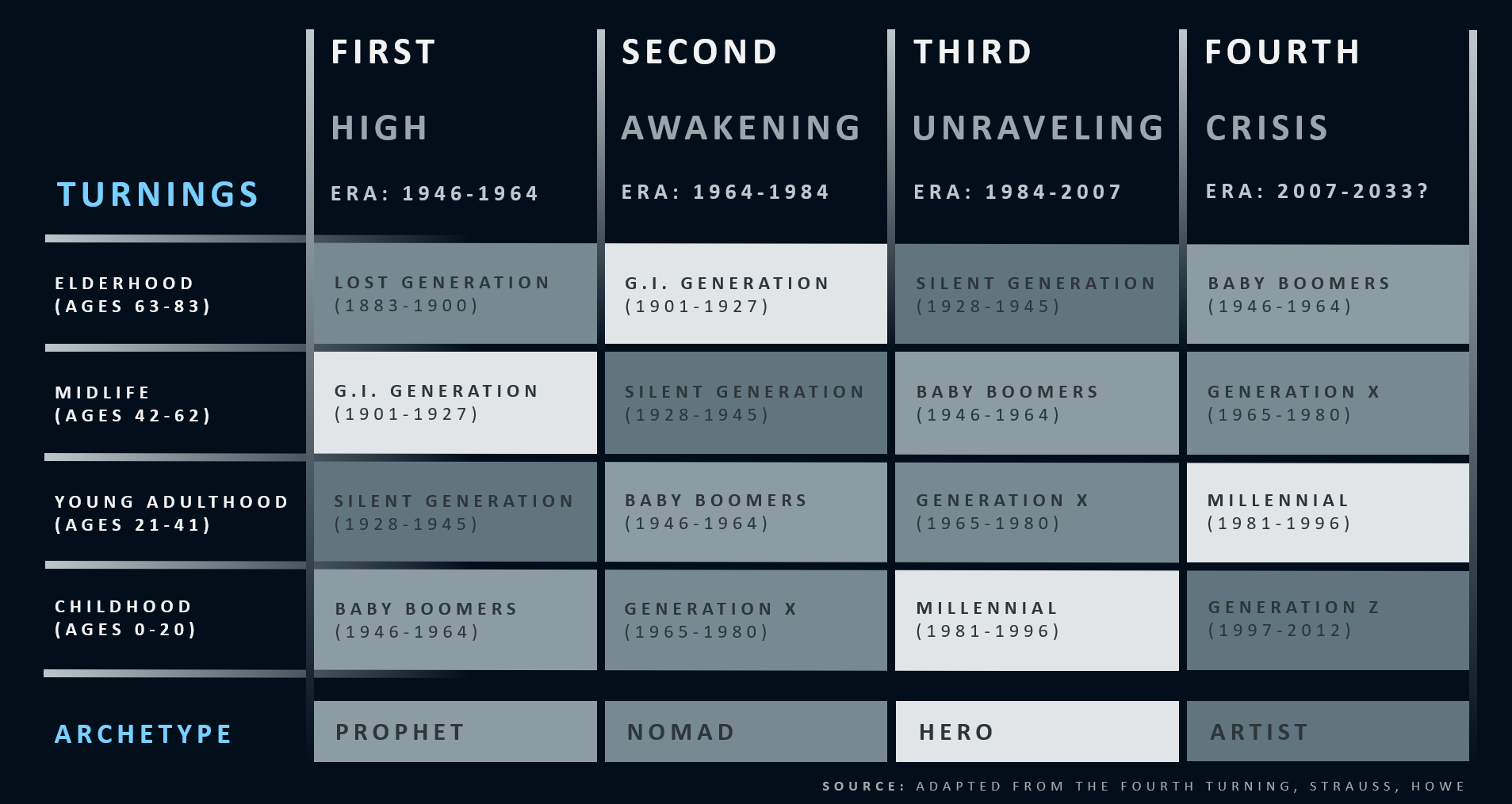 Roughly 80 years later, the next turning began around 2008, marked by the global financial collapse.
