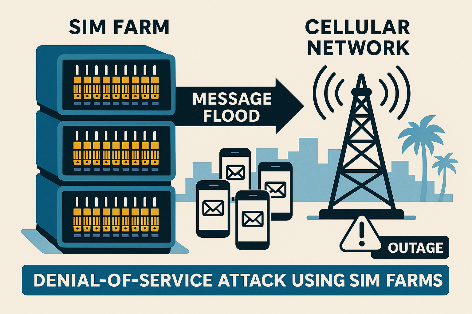 Trigger all SIM servers at once, push out text floods at extreme rates, and the targeted network becomes useless.