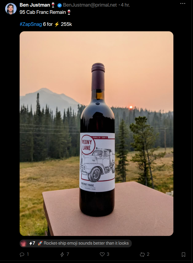 "Fresh batch of low-sulfite wine from high-elevation vineyards! 100,000 sats per bottle. First zap snags it!"